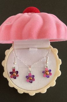Pretty handpainted reversible flower pendant with matching earrings jewellery gift set.