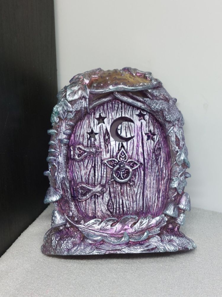 Purple & Holo Silver - L Moon Forest Fairy Door Ornament - Ready to Go & Custom Made - 15.5 cm - Ornaments for the Garden / Glasshouse - Fairy Village Colors - Hand Made with resin, mica powd