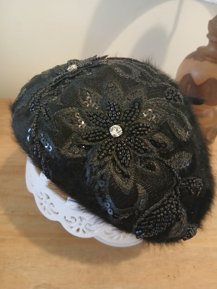 Customised Angora Wool Berèt - Black - Handsewn 3D Floral Appliquè