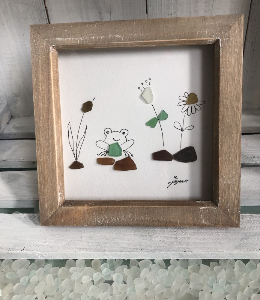 Frog in the garden. Made from naturally geniune tumbled seaglass collected by me and my family from Italy. wooden frame 7 inches X 7 Inches