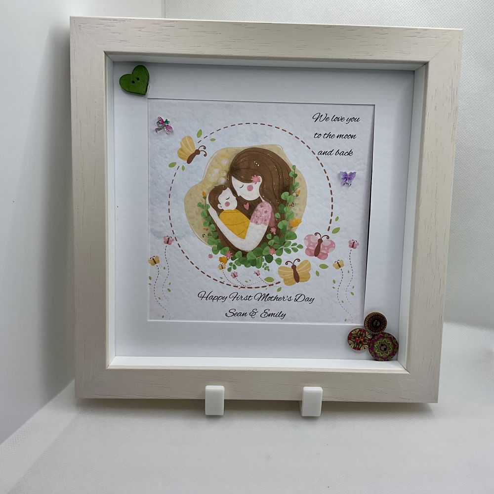Celebrate a first Mother's Day with a thoughtful and unique gift - a personalised handmade frame! This special gift is the perfect way to commemorate this milestone occasion. Handcrafted with care, this frame can be customised with the new mother's name or a heartfelt message. Show your love and appreciation for the new mother in your life with this meaningful and beautiful gift. Perfect for displaying in any home or office, this frame is a wonderful reminder of the joy of becoming a mother.